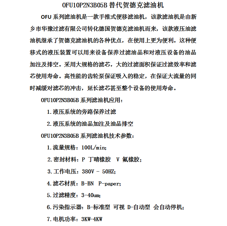 賀德克兩級濾油機OFU10P2N3B05B
