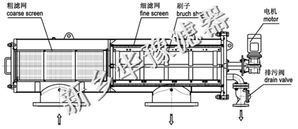 污水由設備的入水口進入過濾器內(nèi),粗濾網(wǎng)先對污水中的體積較大的雜質(zhì)進行攔截,防止這些雜質(zhì)進入機體內(nèi)部后損壞機體內(nèi)的部件。粗濾后的水流向機體另一端的細濾網(wǎng),細濾網(wǎng)對水中的雜質(zhì)及污物進行最后的攔截。因為污垢對濾網(wǎng)的堵塞,使濾網(wǎng)內(nèi)部和濾網(wǎng)外部生壓力差,當這個壓力差達到壓差開關(guān)的設定數(shù)值時,電控箱發(fā)出清洗、排污信號,控制機體上的排污閥與清掃電機同時打開。電機轉(zhuǎn)動帶動機體內(nèi)的不銹鋼刷對濾網(wǎng)上的污垢進行清理,再通過排污口排出污水,完成一次自清洗過程。該過濾器同時安裝有定時控制器,可在一定時間間隔內(nèi)定時排污。